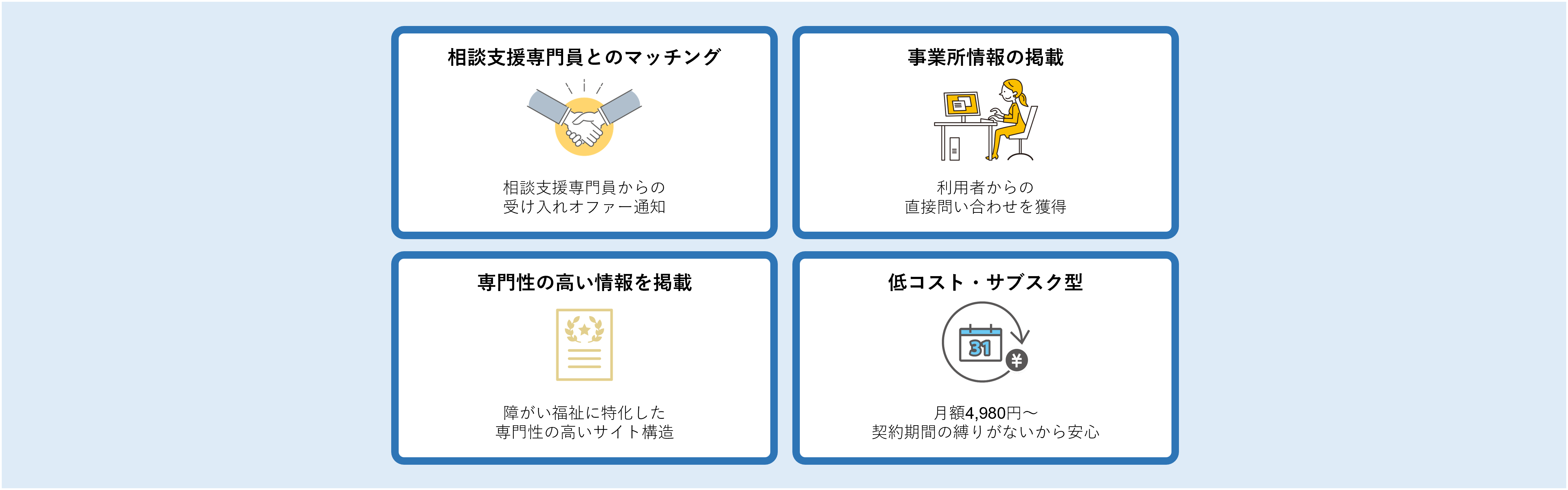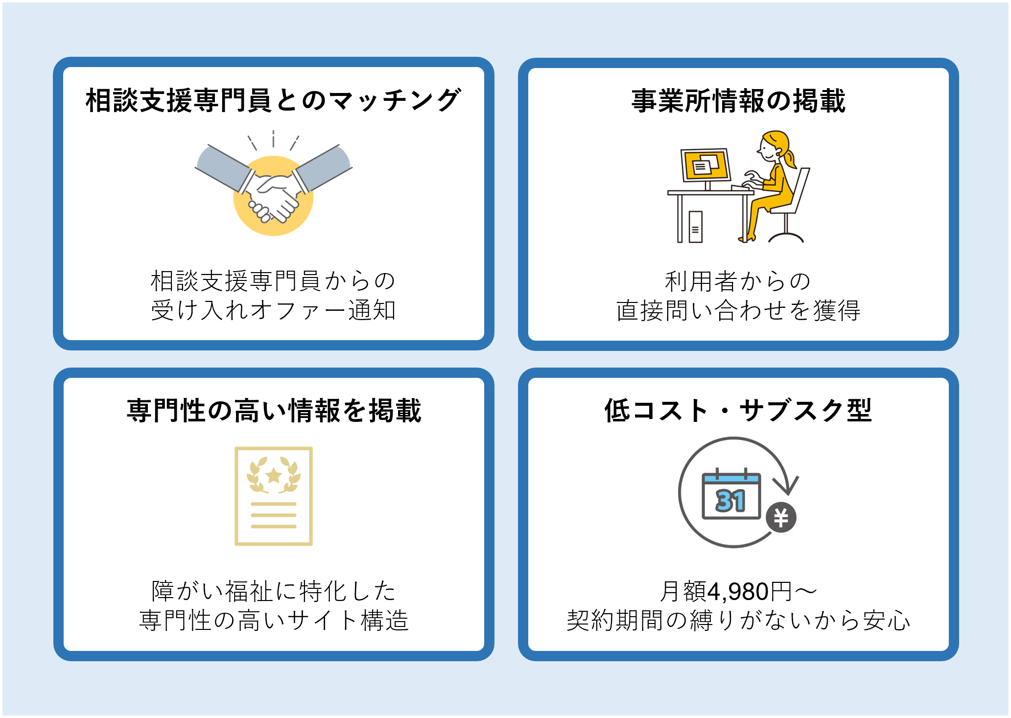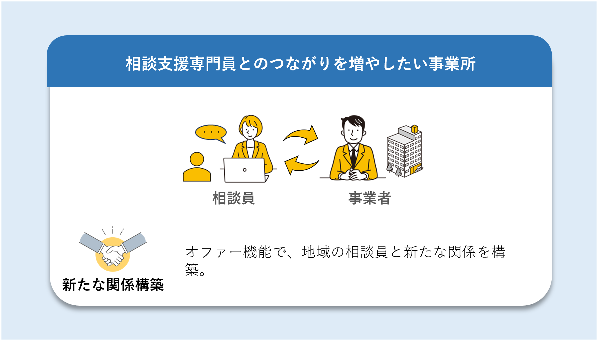 相談支援専門員にとっても、信頼できる事業所を見つけやすく、事業所にとっても、これまで接点のなかった相談員との新たな関係構築が可能です。